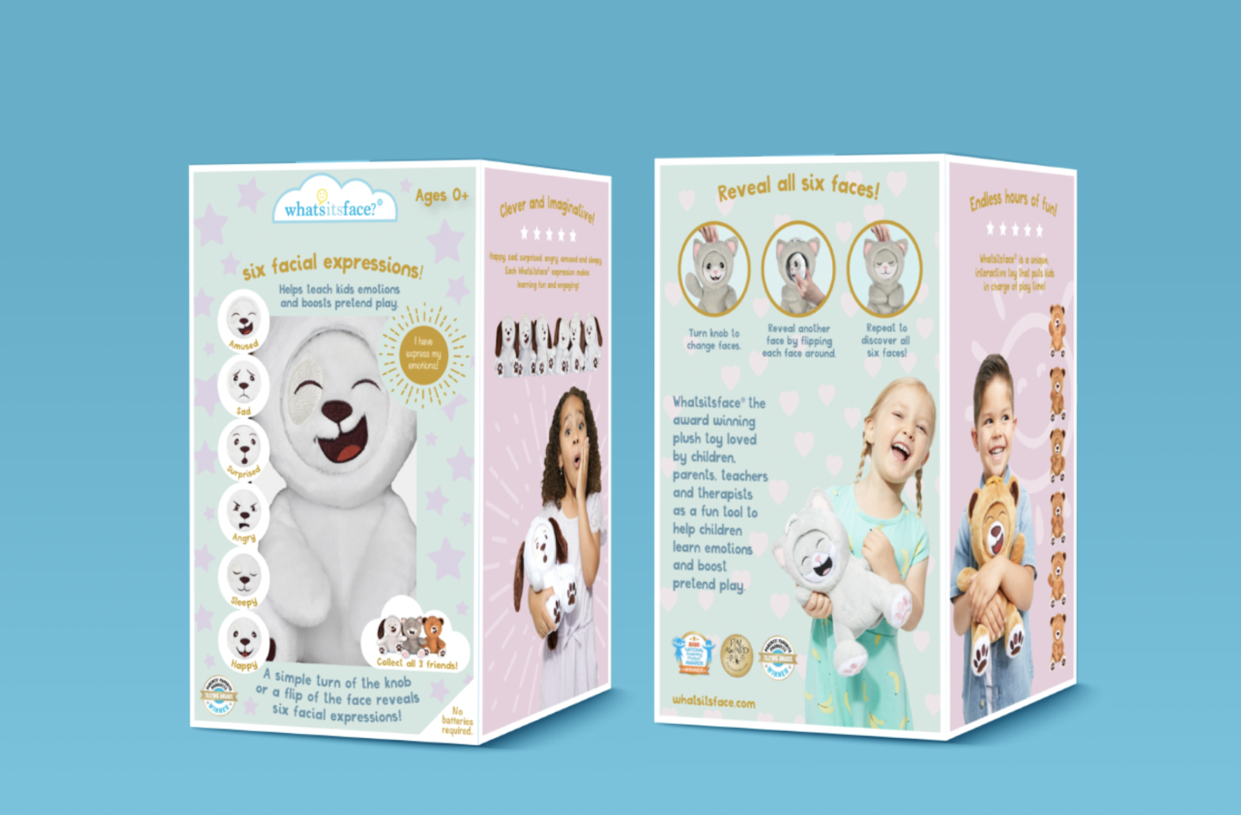 Whatsitsface is an emotional plush toy featuring six facial expressions, helping children to learn about emotions through interactive play. This company was founded by Joanna Paul and eventually licensed to a toy company. Our work included:
